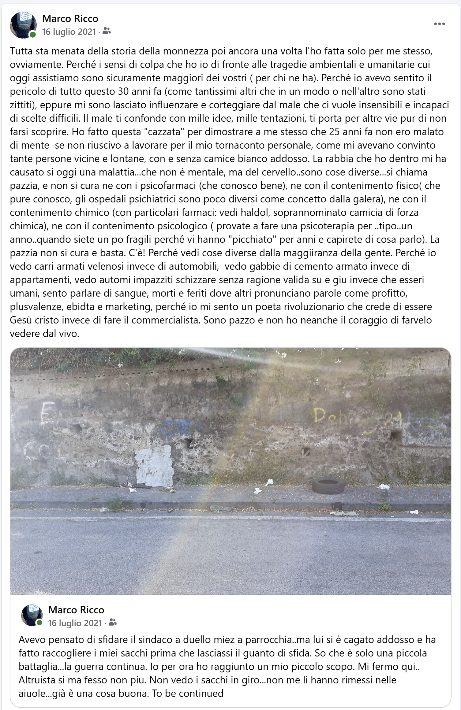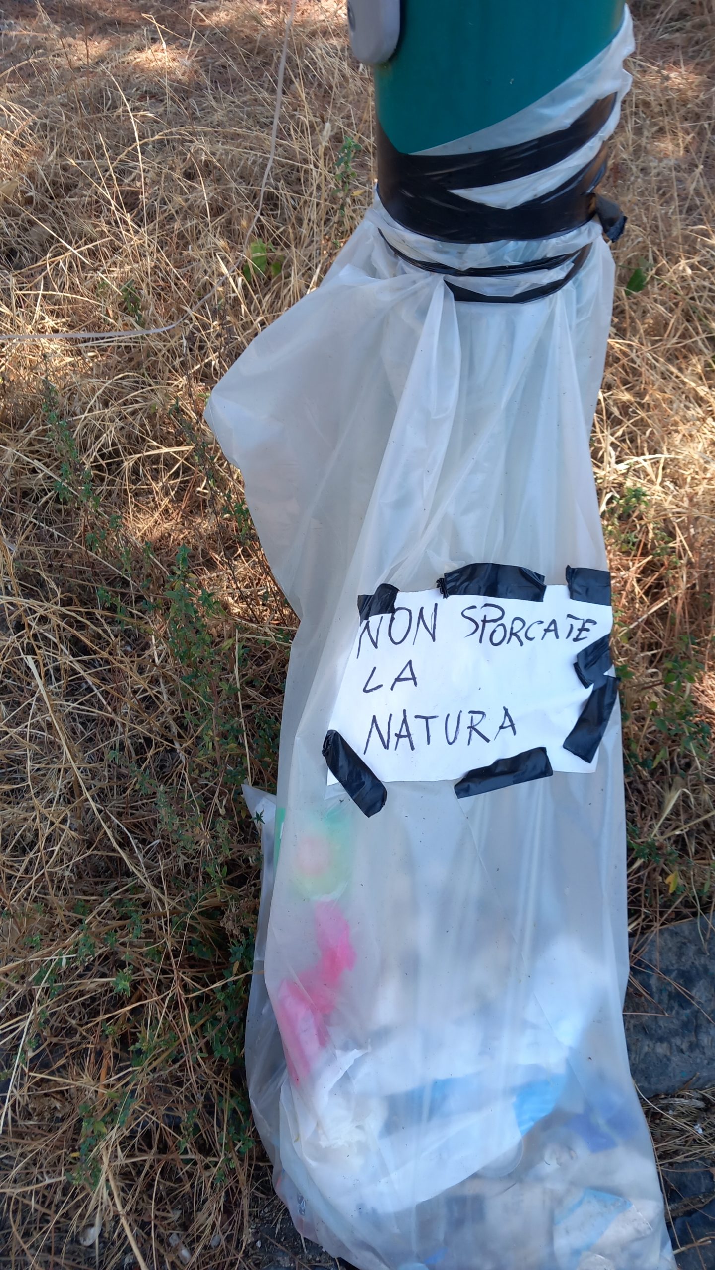 A partire dal Giugno 2021, dopo un periodo di grosse difficoltร  personali, comincio a fare piccole azioni dimostrative nel quartiere dove vivo e poi man mano nel resto della cittร , segnalando disservizi nella gestione rifiuti all’amministrazione comunale. In particolre inizio a fare periodiche pulizie da cartacce e rifiuti vari di un’aiuola pubblica posta appena fuori all’ingresso di una scuola media (uso il termine improprio rifiuto per semplicitร …so bene che non esisterebbero rifiuti, ma solo materiale da recupero da avviare a riciclaggio o riuso tramite raccolta differenziata). Spesso ripongo il materiale raccolto in un sacco e ci metto sopra la scritta “Non Sporcate la Natura“.